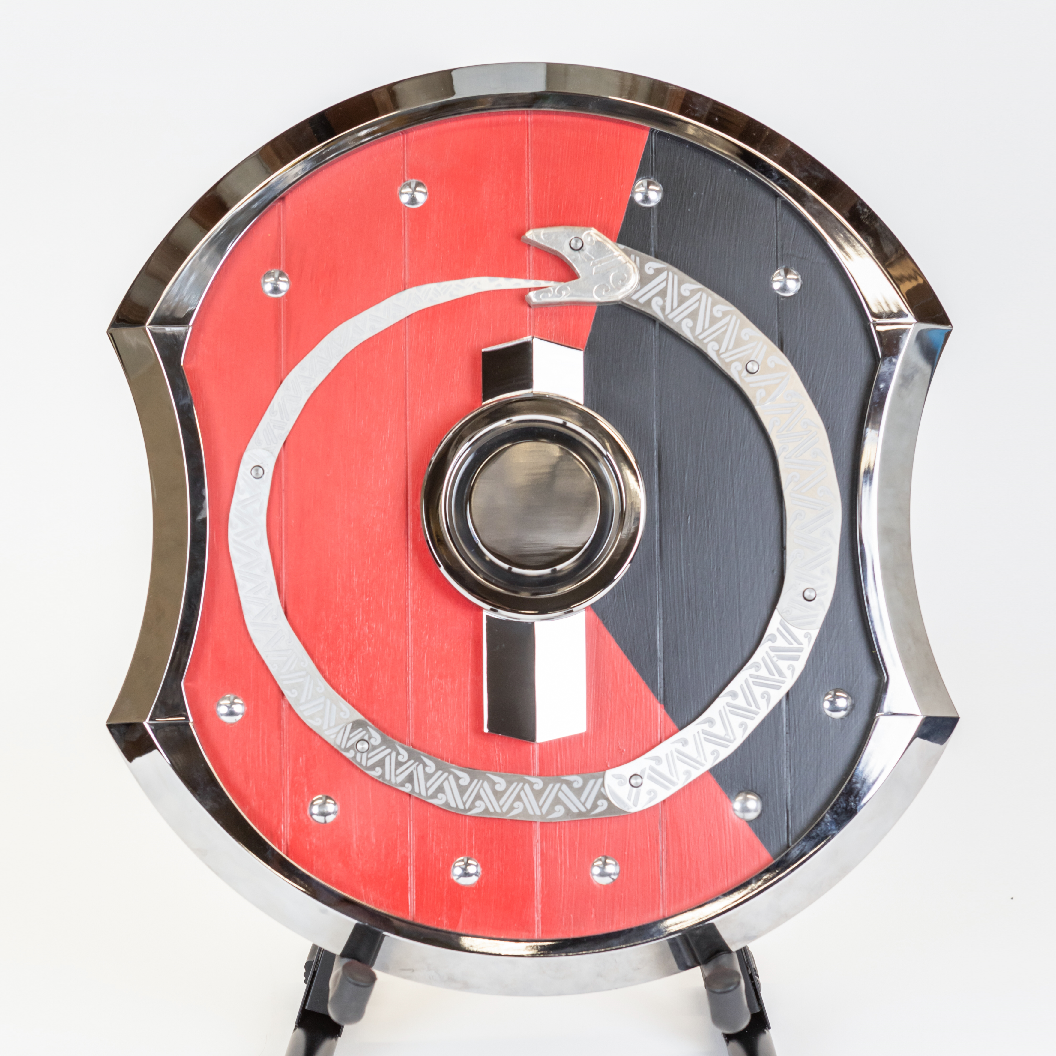 Sturdy construction of steel, wood, chrome-plated aluminum, and an etched Jörmungandr emblem with a cast pewter head.